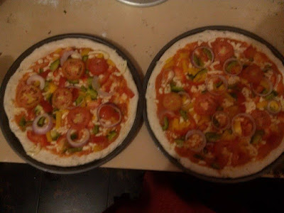 Butter lightly the pizza pan. Roll out the dough in a round shape