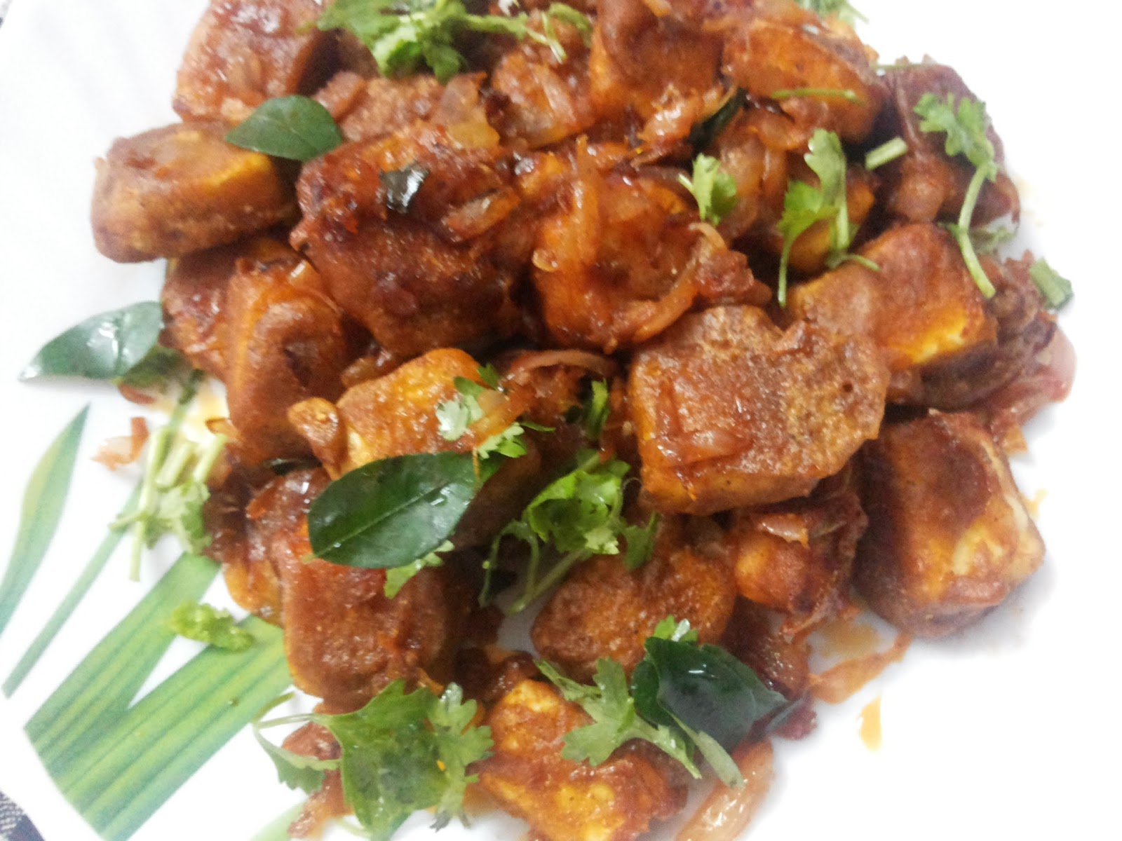 Cut paneer into square shapes and mix it well with the paste. Prick the paneer cubes using a fork. This helps the paneer to absorb the masala. In a hot pan, add some oil and deep fry these paneer cubes until it turns golden brown in color. In another pan, add two tablespoon of oil and saute the sliced onions. Once it becomes golden brown color, add 2 teaspoon of red chili powder, little salt and curd. Saute it for a minute. Finally add the deep fried paneer into this and cook it for two minutes. Garnish it with coriander and curry leaves.