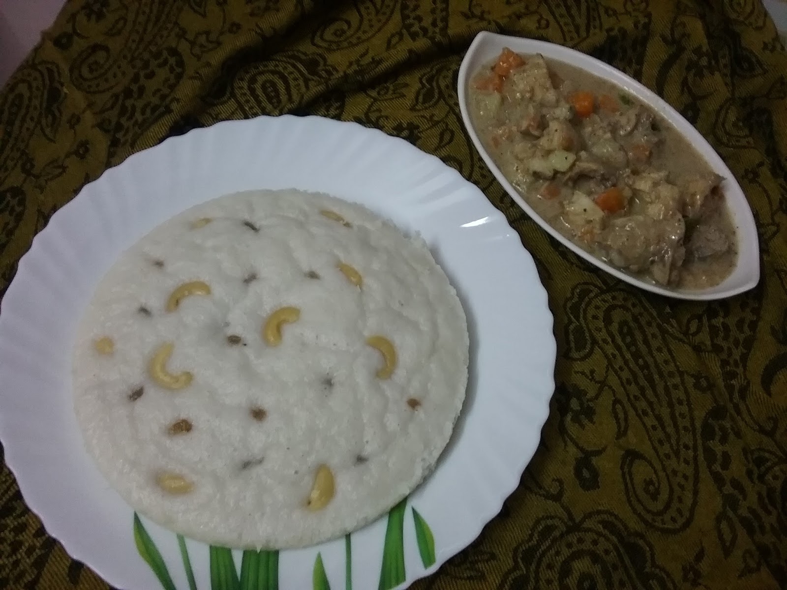 In a pan, add little ghee and fry onions until it becomes dark brown in color. Also, add raisins an cashew nuts to this and keep it aside.